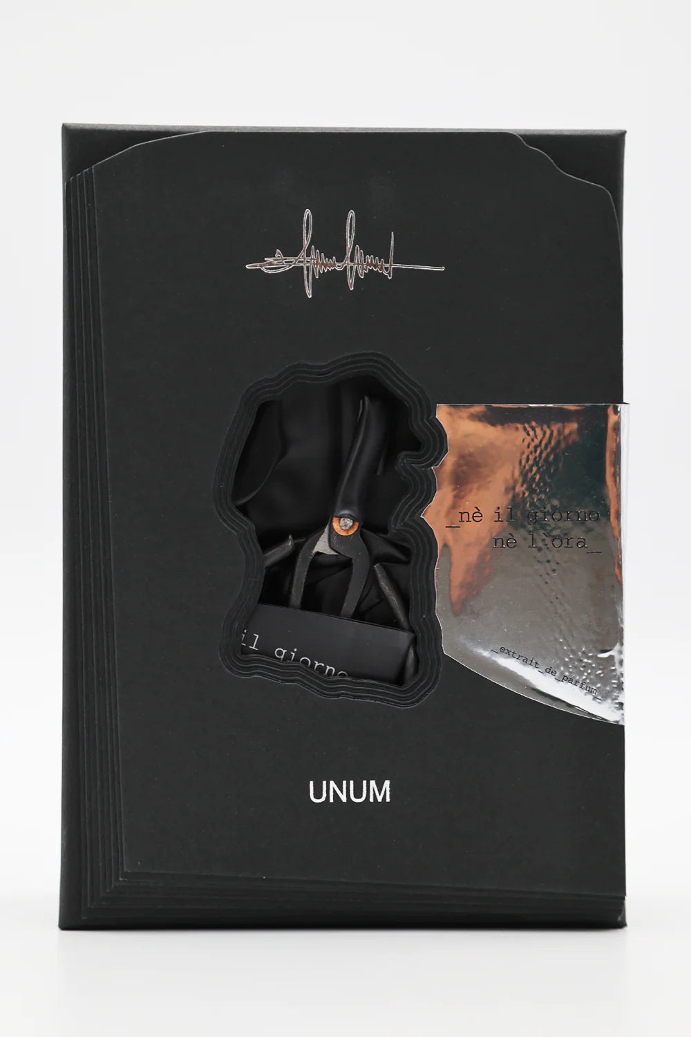 Il flacone è allineato al linguaggio estetico della collezione UNUM, con finiture curate, scatola sigillata e presenza di elementi di design che enfatizzano il carattere concettuale del profumo.