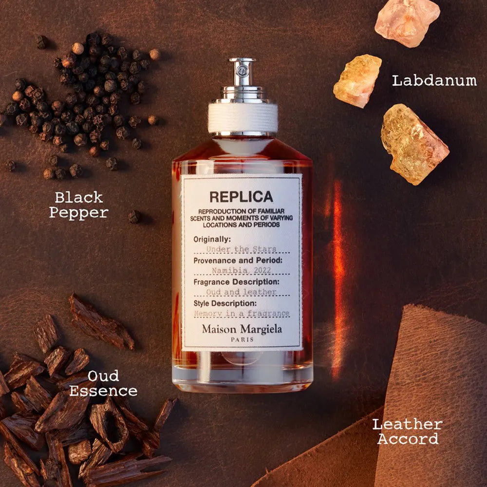 Under The Stars è un’Eau de Toilette unisex appartenente alla collezione Replica di Maison Margiela. È una fragranza orientale‑legnosa, intensa e avvolgente, con note di oud, cuoio, ambra e spezie, che ricreano l’atmosfera di una notte stellata immersa nella natura selvaggia.