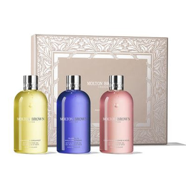 Il set Floral & Fruity Body Care Gift Set 3 × 300 ml di Molton Brown propone tre gel doccia corpo in formati generosi, ciascuno caratterizzato da una fragranza distintiva: Delicious Rhubarb & Rose, Lily & Magnolia Blossom, Orange & Bergamot. La confezione è pensata come regalo elegante o come coccola quotidiana per chi ama profumare pelle e spirito con un tocco vivace e raffinato.